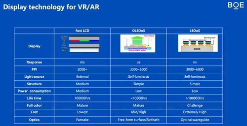来源:Meta 对更高视觉体验的持续需求BOE AR/VR CTO 张浩指出,更高的 PPD 有助于提升清晰度,更大的 FoV 可增强沉浸感。当前 AR/VR 显示的主要挑战包括:高分辨率、准确色彩以及在强光环境下的高亮度表现。 他分析了不同显示技术的局限性:LCD 受限于 PPI,MicroOLED 成本较高,MicroLED 在全彩实现方面仍存在难点。此外,系统还面临光学问题(如色分离、重影、不均匀亮度)以及带宽与实时渲染带来的系统压力。