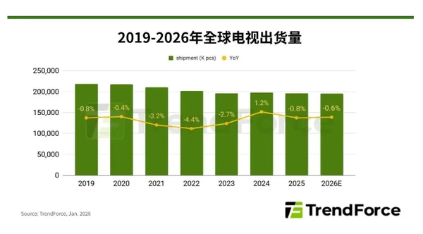 TrendForce:2026年电视产业出货预期下调,Mini LED逆势上修渗透率至10%根据TrendForce集邦咨询最新发布的全球电视出货调研报告,2026年电视产业正面临存储器、面板及贵金属等关键原材料价格同步走高,整机制造成本持续攀升。受此影响,2026年全球电视出货预估进一步下修,由原先预期的年减0.3%调整至年减0.6%,全年出货量预计为约1亿9,4 81万台。在现有成本结构难以支撑原有价格体系的背景下,新机型零售端价格上调已成必然趋势。